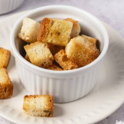 You can also freeze croutons (packaged the same way) for up to 6 months. Thaw at room temperature and re-crisp in the air fryer at 375°F for about 5-8 minutes.