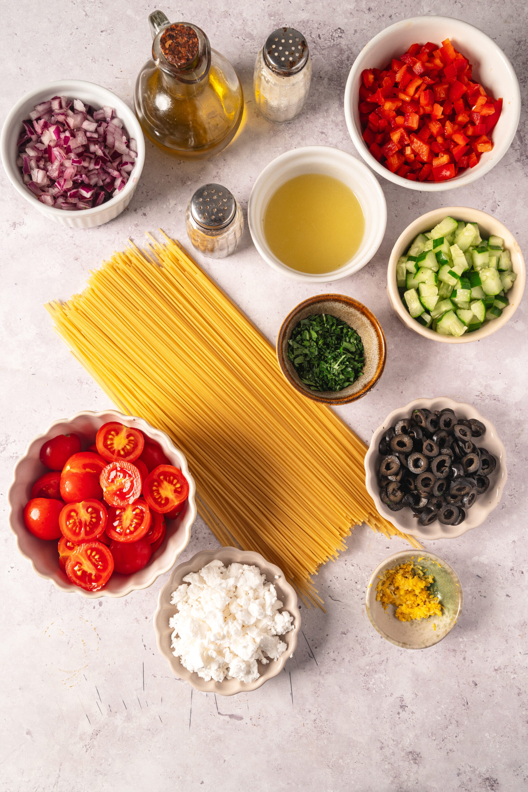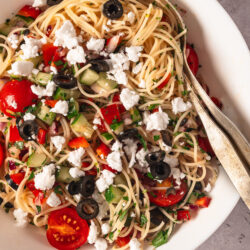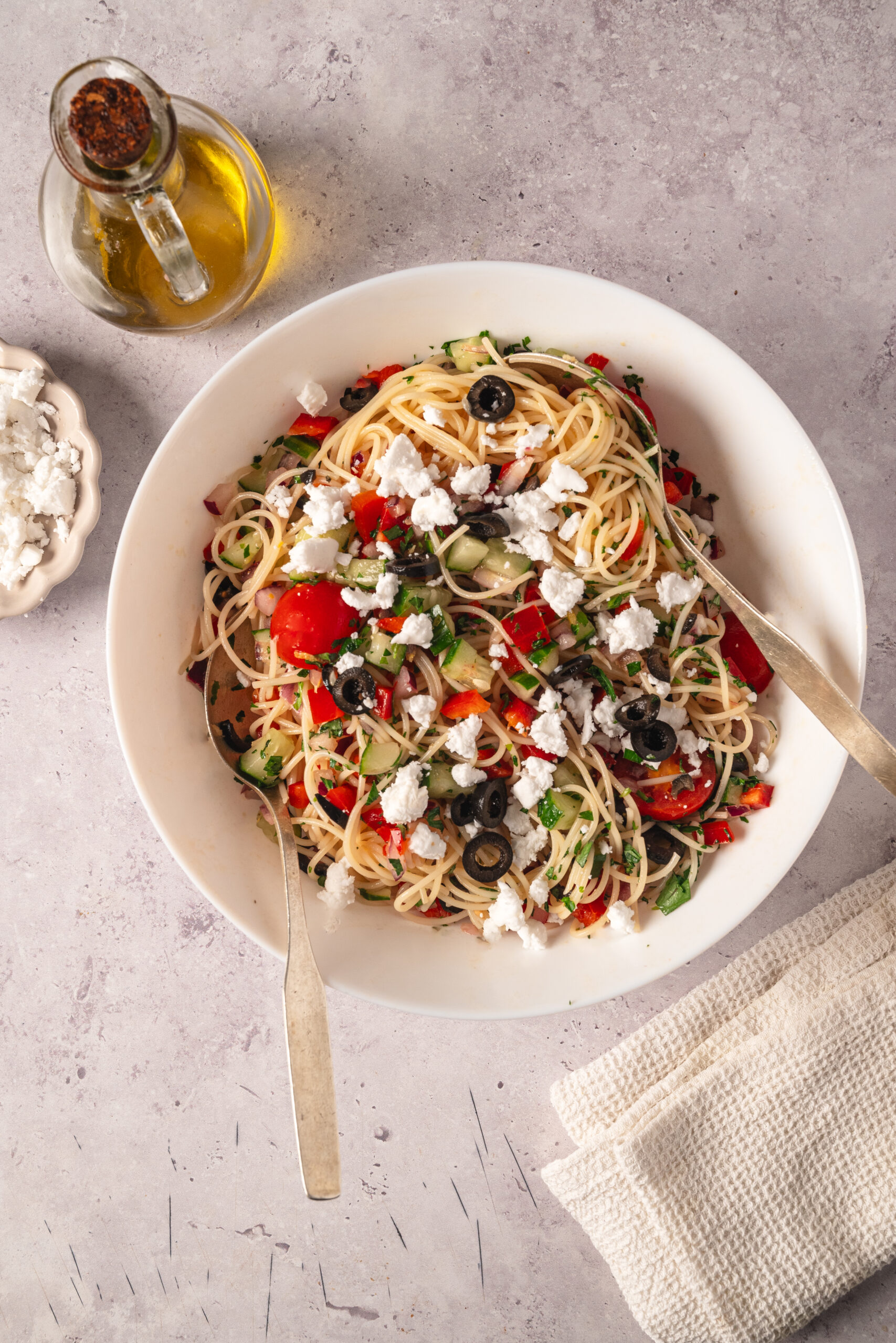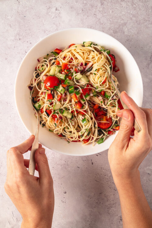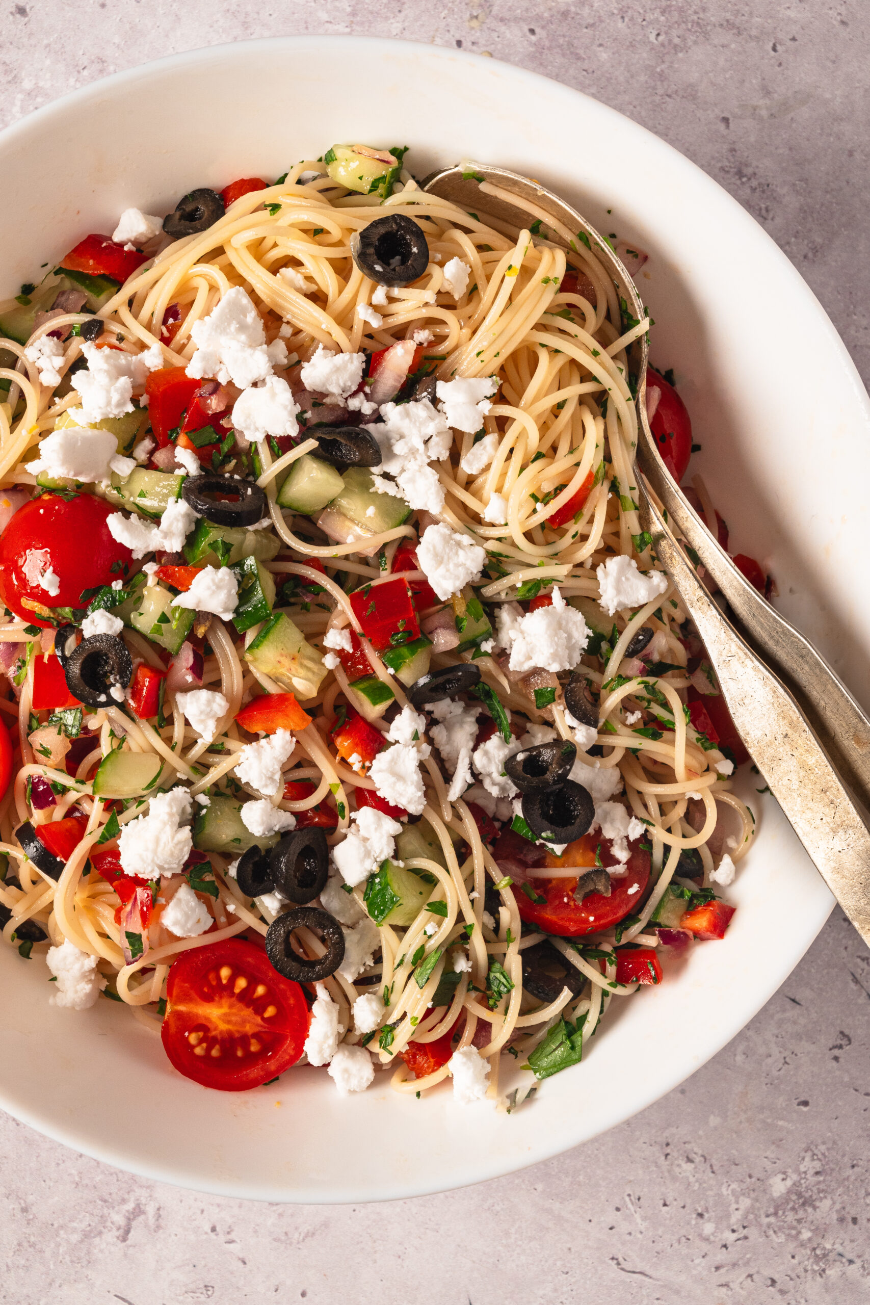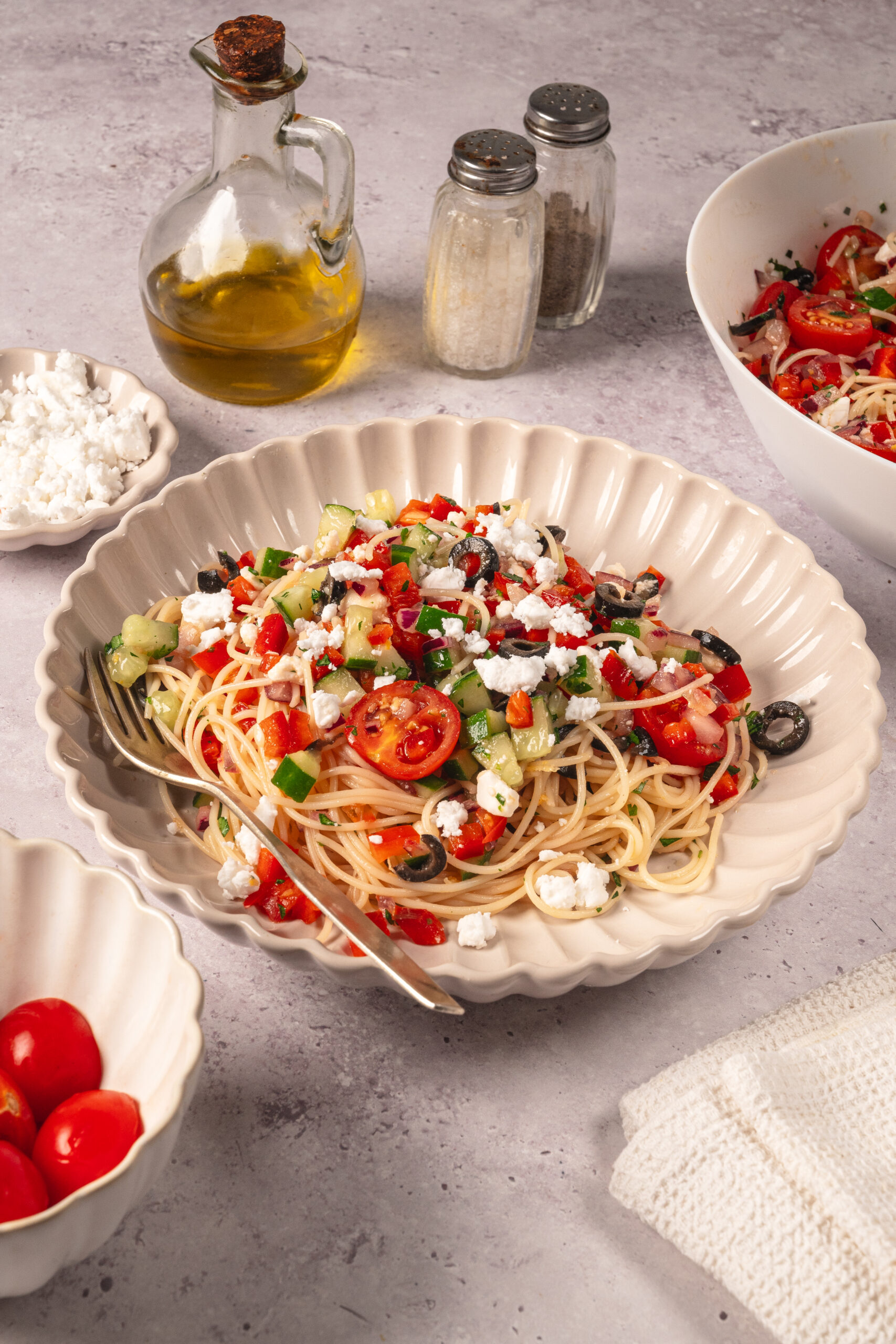 Our angel hair pasta salad is a go-to for any of those occasions. The perfectly cooked, very thin, and delicate angel hair noodles provide such a satisfying bite when paired with the freshness of the tomatoes, cucumbers, bell peppers, and red onion. The wonderful blend of lemon juice and olive oil coats everything, and then the salad is topped with the salty, tangy feta cheese. And no matter what occasion you make it for or to whom you serve it, it will impress because not only is it delicious, it’s also very beautiful. We may have named this salad for the type of pasta we’re using, but you’ll find everything about it divine!