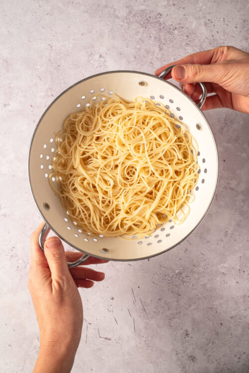 - Bring a large pot of salted water to a boil. Add the angel hair pasta and cook according to the package directions until al dente. Drain the pasta and rinse it under cold water to stop the cooking process.