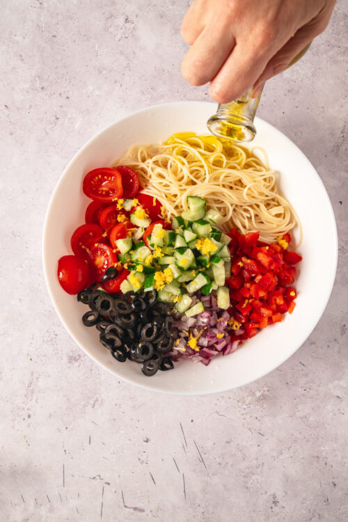 - In a large bowl, combine the cooled pasta with the vegetables, olives, and parsley. Drizzle with extra-virgin olive oil and lemon juice, sprinkle lemon zest, and then season with salt and black pepper.