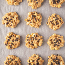 - Drop tablespoon-sized portions onto a baking sheet lined with parchment paper and sprinkle mini chocolate chips on top. Place the cookies in the refrigerator until firm, about 45 minutes.