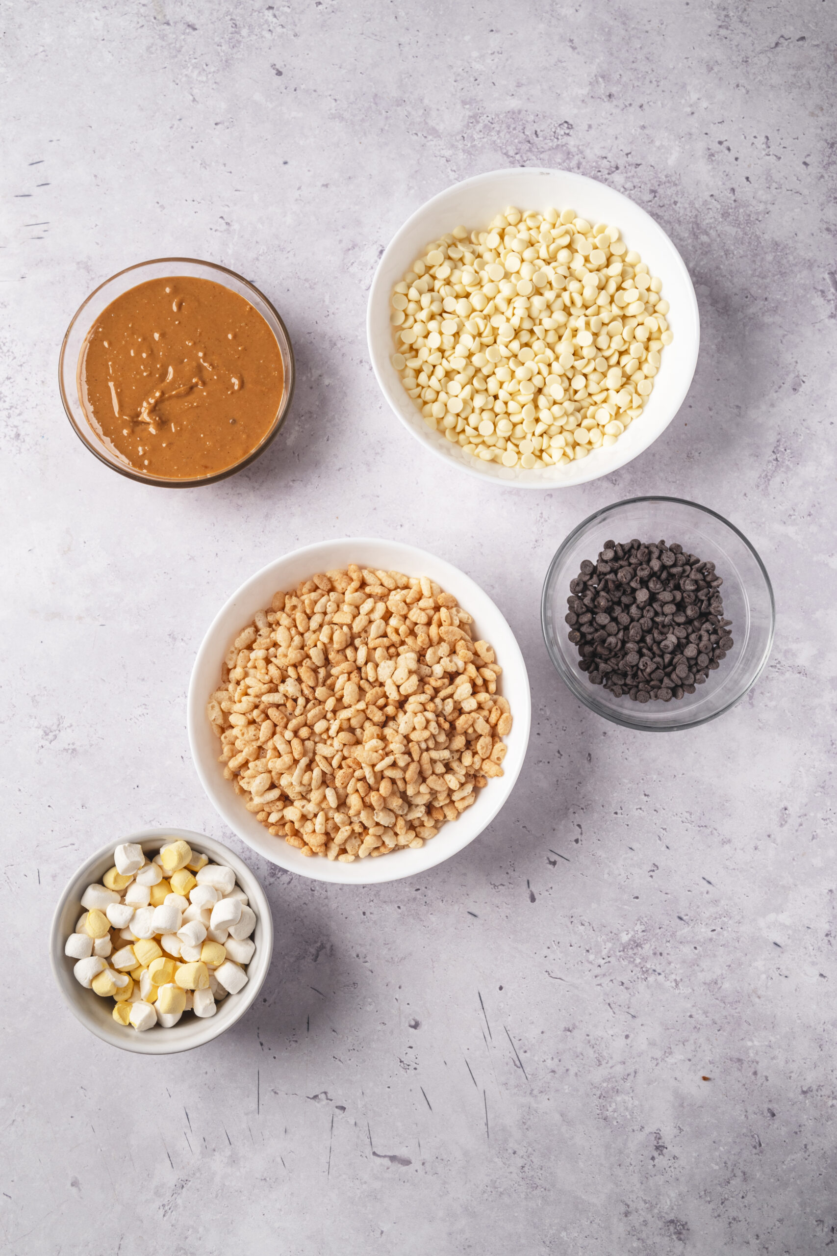 Oh, how much do we love a no-bake dessert? Very much! Especially when it’s this super simple recipe that yields such a delicious treat. We melt white chocolate with creamy peanut butter, add Rice Krispies and mini marshmallows, and then sprinkle mini chocolate chips on top. No muss, no fuss, no oven! Just a bit of time to firm up in the fridge, and avalanche cookies will be ready to be devoured.