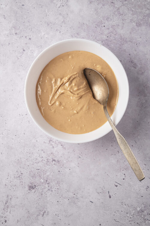 - In a microwave-safe bowl, combine white chocolate chips and peanut butter. Microwave in 30-second intervals, stirring between each, until the mixture is smooth.