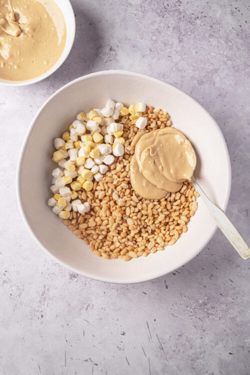 - In a large bowl, combine Rice Krispies cereal and mini marshmallows. Pour the melted mixture over the cereal and stir until everything is evenly coated.