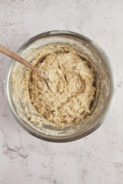 - In a separate bowl, whisk together the all-purpose flour, quick oats, baking soda, baking powder, and salt. Gradually mix the dry ingredients into the wet ingredients until just combined. If the mixture is too wet to hold shape when scooped, add 1 tablespoon more of flour at a time until it firms up. Avoid overmixing.