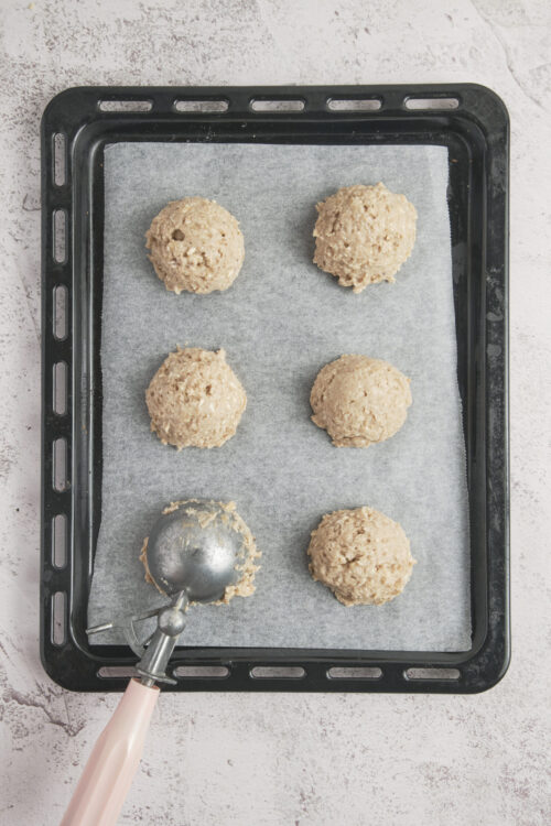 - Drop rounded tablespoonfuls of dough onto the prepared baking sheet, spacing them about 2 inches apart.