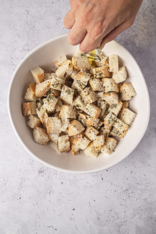 - Preheat your oven to 375°F. In a large bowl, combine the olive oil, Parmesan cheese, dried parsley, garlic powder, dried oregano, kosher salt, black pepper, and dried thyme. Add the bread cubes and toss well to coat evenly.