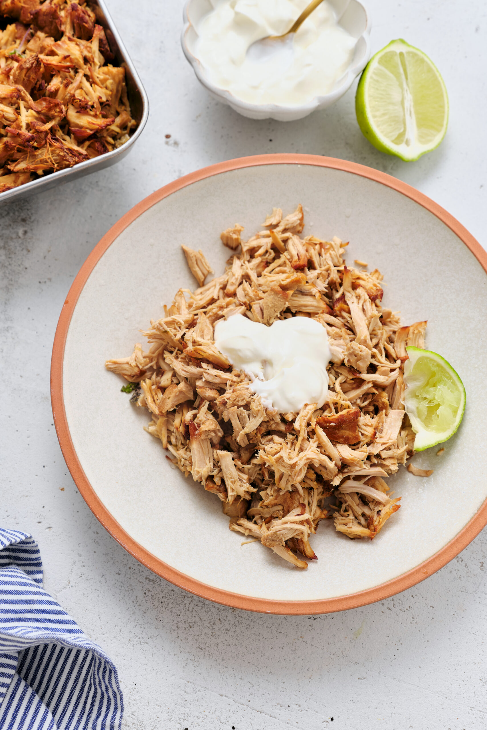 If you decide on chicken “carnitas,” I’d recommend using bone-in, skin-on thighs (drumsticks also work). Chicken breast is way too lean and will dry out—you need every bit of fat you can find to keep these faux carnitas tender and juicy.