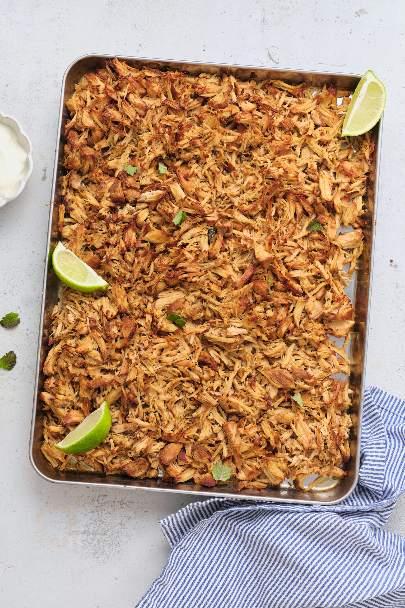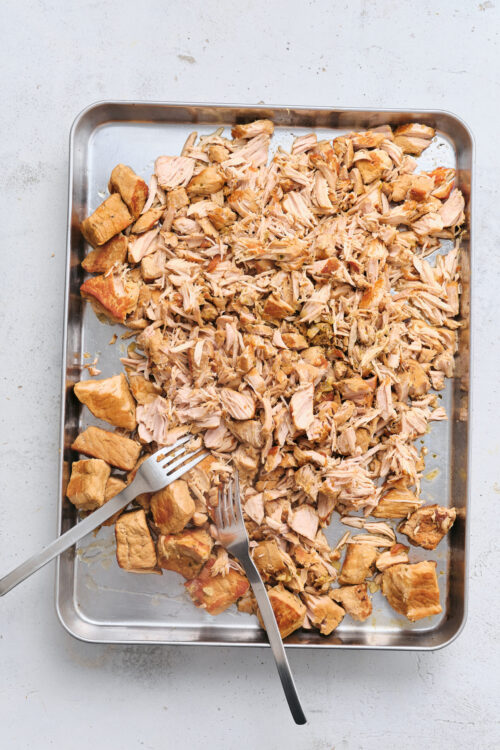 While you can keep the seasoning the same, you’ll need to make adjustments to the cooking time. Chicken doesn’t take as long as pork shoulder. Brown the meat, then simmer for 45 to 60 minutes. After that, shred and crisp the chicken on a sheet pan just like you would for the pork. Basically, you’re following the recipe here with some tweaks to the simmering time.