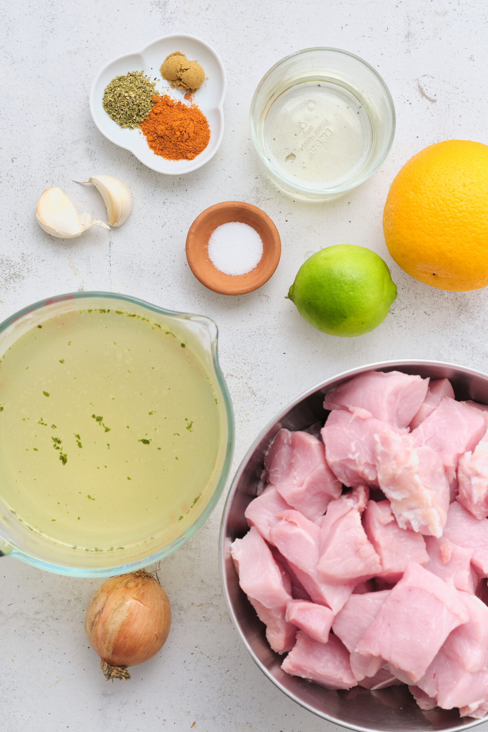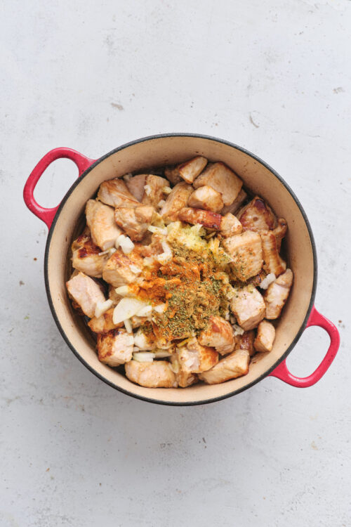- Once browned, add the chopped onion, crushed garlic, lime juice, orange juice, chili powder, dried oregano, and ground cumin. Stir for one minute to combine the flavors.
