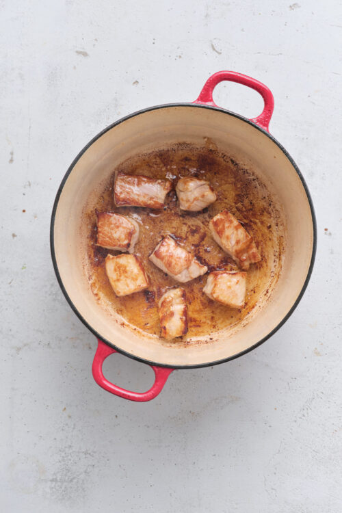 - Heat the oil in a large Dutch oven over medium-high heat. Season the pork shoulder pieces with 1 tablespoon of the kosher salt. Brown the pork in batches for about 10 minutes, turning so all sides get a light color.