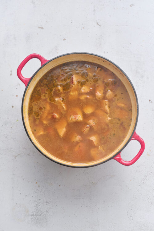 - Pour in the chicken broth and bring the mixture to a boil. Reduce the heat to low, cover the pot, and let it simmer for 2 1/2 hours until the pork is very tender.
