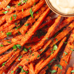 Like all good fries, carrot fries are best when paired with some delicious dips! Of course, they are fabulous dipped in Homemade Ranch Dressing, but we also love them with herby Easy Green Goddess Dressing. And speaking of green, try dipping your carrot fries in Homemade Basil Pesto for a delicious taste sensation! Carrot fries also make a perfect side to anything you’d normally pair French fries with, such as a Rib Eye Steak, a Bacon Cheeseburger, or these Slow-Cooker Turkey Dip Sandwiches (and you can dip the fries in the broth served on the side!). For a really great meatless Monday (or any day!) meal, I make the Vegetarian Feta Burger With Tzatziki Sauce: I put some of the crunchy carrot fries inside the burger and also serve some on the side to dip into that cool and creamy yogurt sauce!