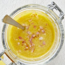 Naturally, champagne vinaigrette is simply lovely on a simple Green Salad, but it’s also perfect on a more complex one, like Spinach Salad (champagne vinaigrette is so good with this salad’s apples, walnuts, dried cranberries, and goat cheese). But there are many other creative ways beyond salads to use this wonderful vinaigrette. One of my favorite things to do is to drizzle champagne vinaigrette over warm vegetables, such as these Delicious Grilled Green Beans, Roasted Potatoes, or simple Steamed Asparagus. Champagne vinaigrette is also delightful with seafood: toss Boiled Shrimp in it, pour a thin stream over Dijon-Baked Salmon, or use it as a tangy dip for these yummy Fish Sticks.