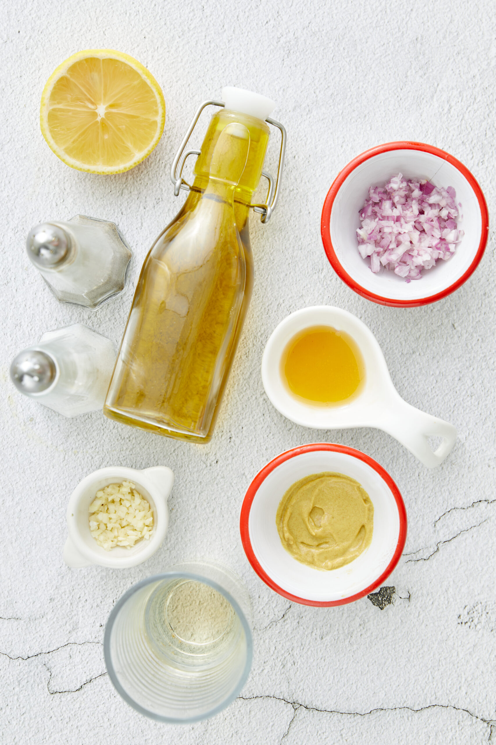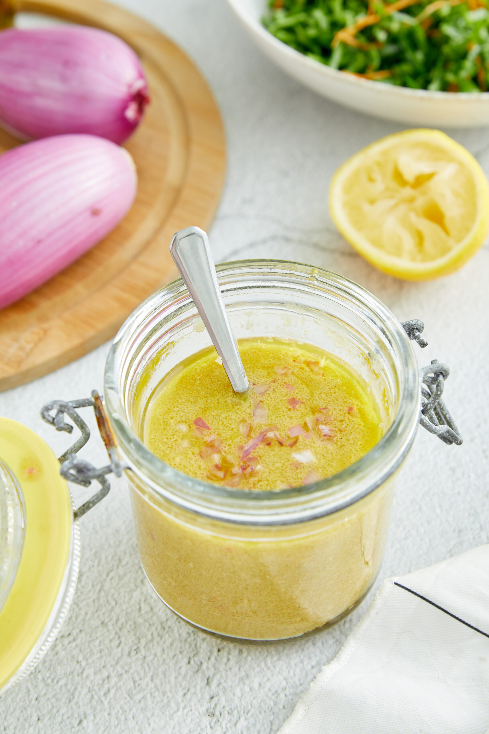 - Place the minced garlic and shallot in a small bowl. Add the champagne vinegar, Dijon mustard, honey, lemon juice, salt, and black pepper. Whisk well until the mixture is fully blended.