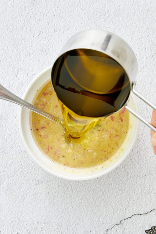 - Slowly drizzle in the extra-virgin olive oil while whisking continuously until the dressing is smooth and emulsified.