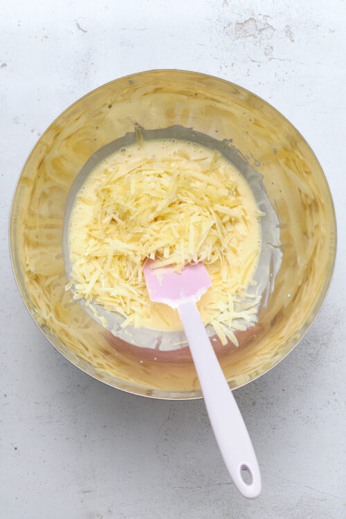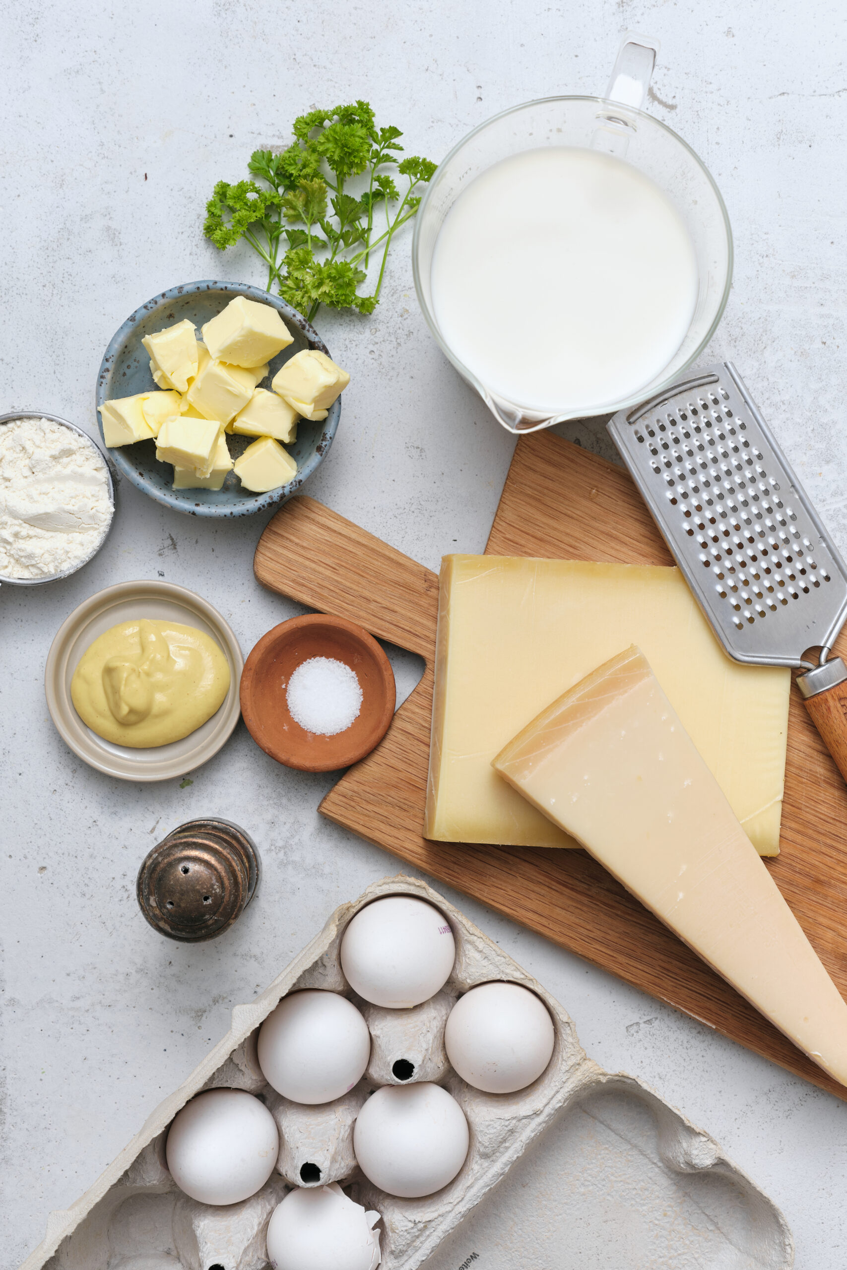 - Let the sauce cool slightly. Then, whisk in the egg yolks one at a time until well combined. Fold in the grated Gruyère cheese.
