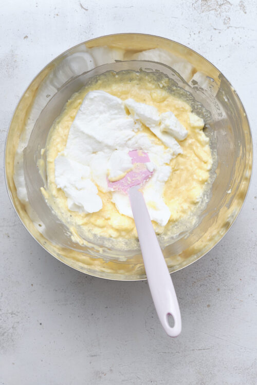 - Whisk the egg whites with a pinch of salt in a clean bowl until stiff peaks form. Then, gently fold them into the sauce in three additions, being careful not to deflate the batter.
