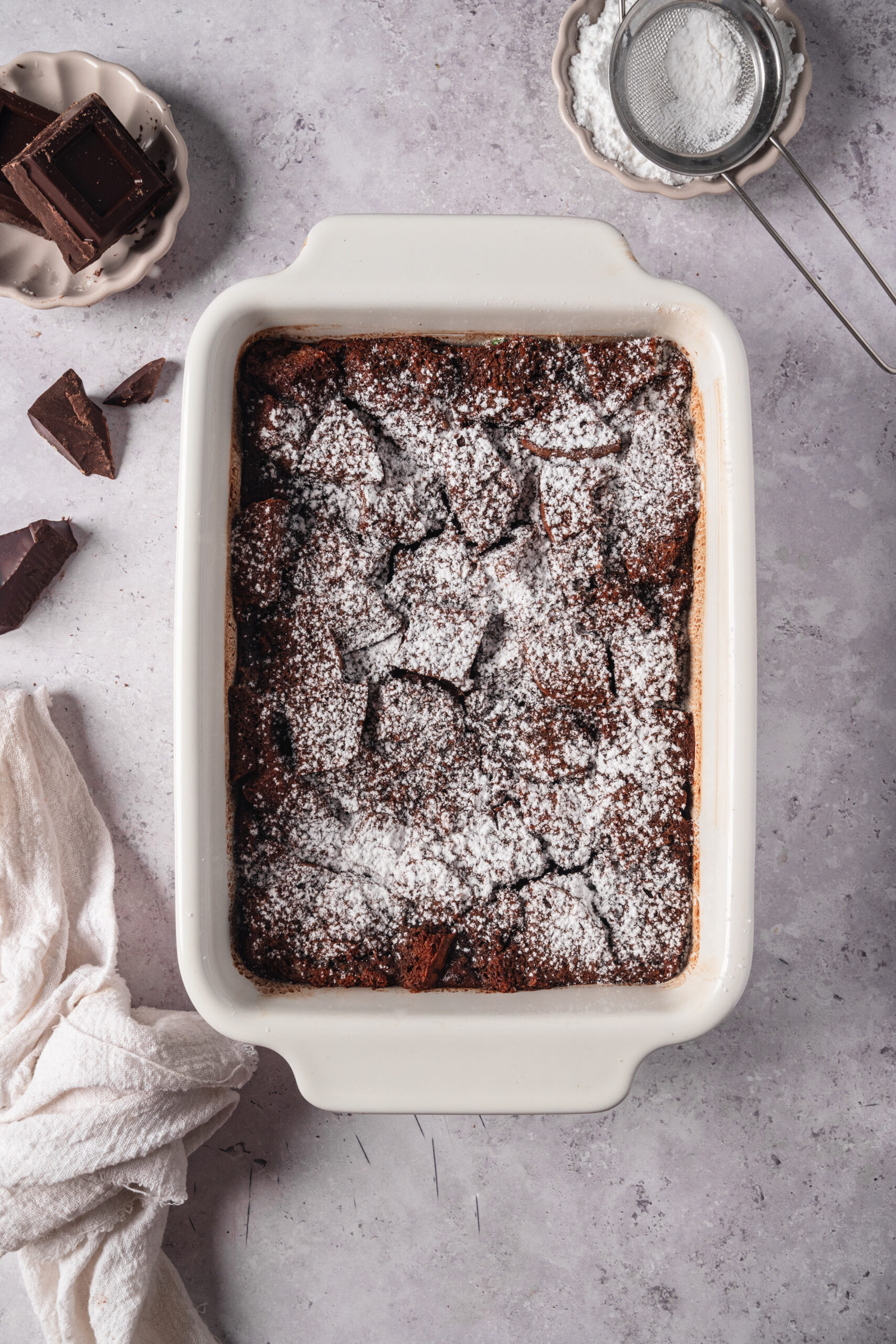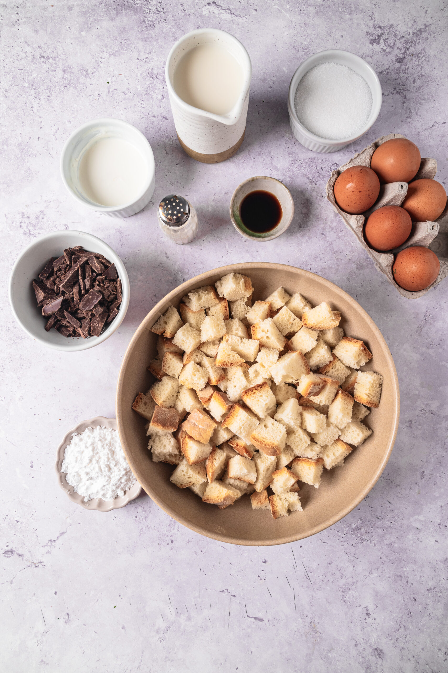 - Place the bread cubes in a greased 9×13-inch baking dish. Pour about half of the chocolate custard over the bread and gently toss until the cubes are evenly coated. Let stand for 10 minutes, then pour the rest of the custard over the top.