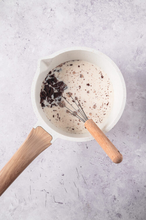 - In a small saucepan, heat the whole milk and heavy cream over medium heat until it starts to simmer. Remove the pan from heat and stir in the chopped chocolate until it melts. Let the mixture cool slightly.