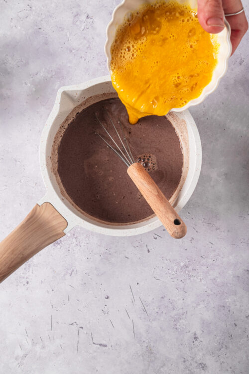 - Slowly pour the warm chocolate mixture into the egg mixture while whisking continuously until well blended.