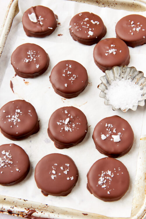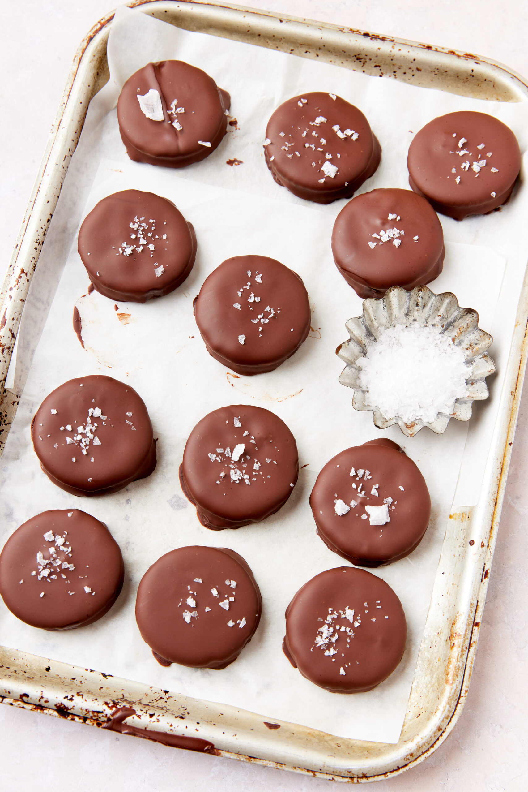 - If desired, sprinkle with a few sprinkles or some flaky sea salt on top before the chocolate sets. Allow the treats to cool for about 20 minutes, until the chocolate has hardened.