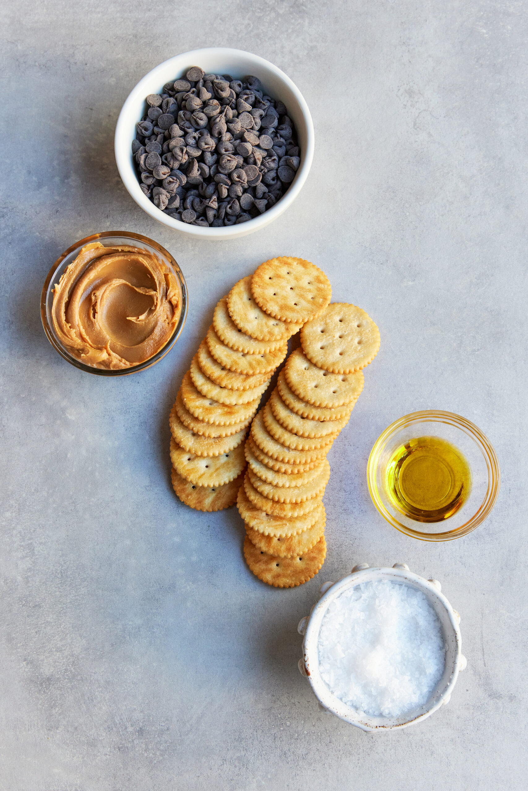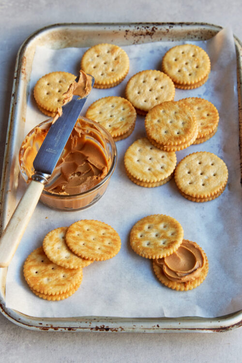 - Line a baking sheet with parchment paper. Spread about 2 teaspoons of peanut butter on one Ritz cracker and top it with another cracker. Press lightly to form a sandwich. Repeat with all crackers to make 12 sandwiches.