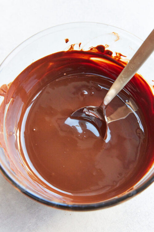 - Place the chocolate and vegetable oil in a microwave-safe bowl. Microwave at 50% power for 1 minute, stir, then heat in 30-second increments until smooth.