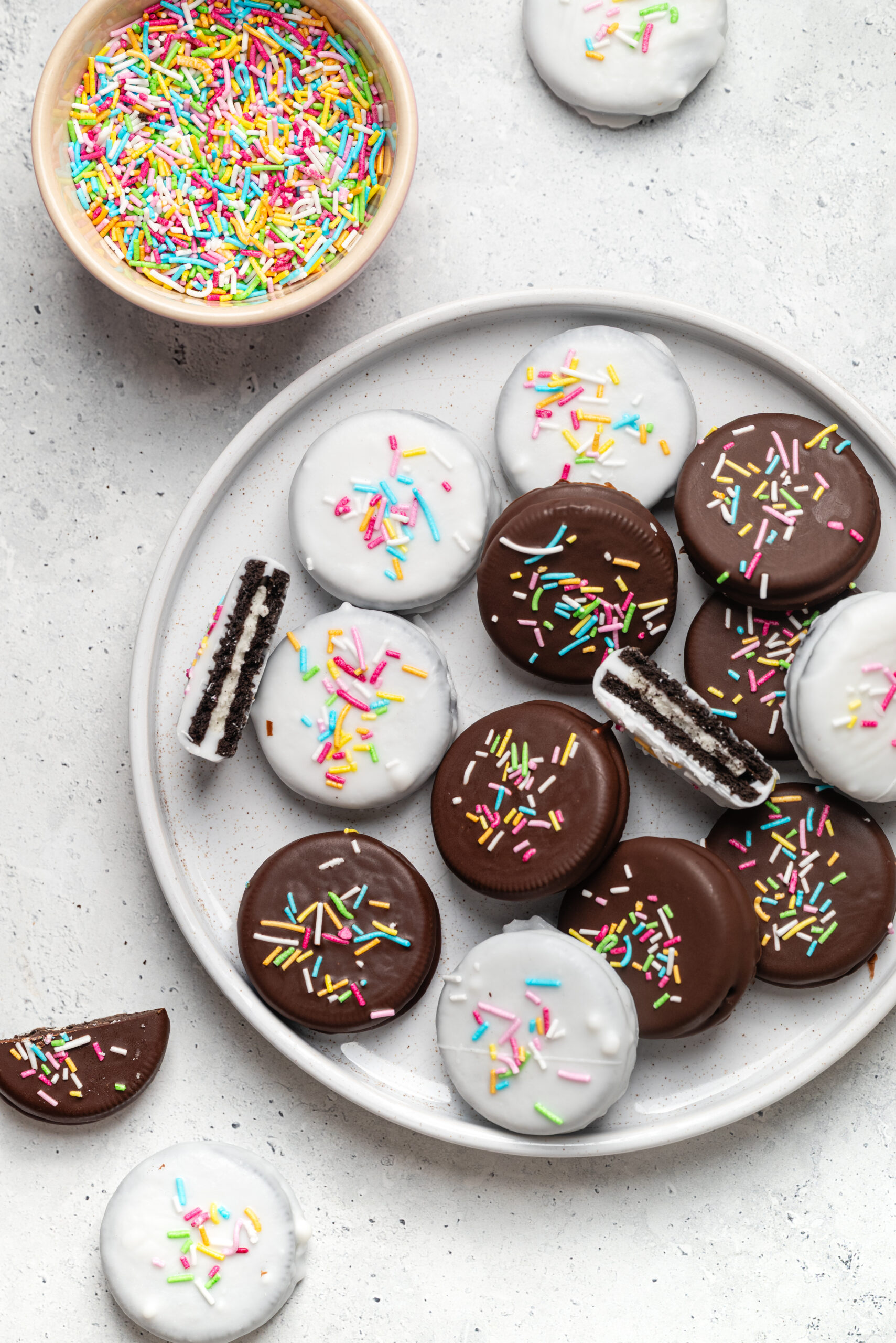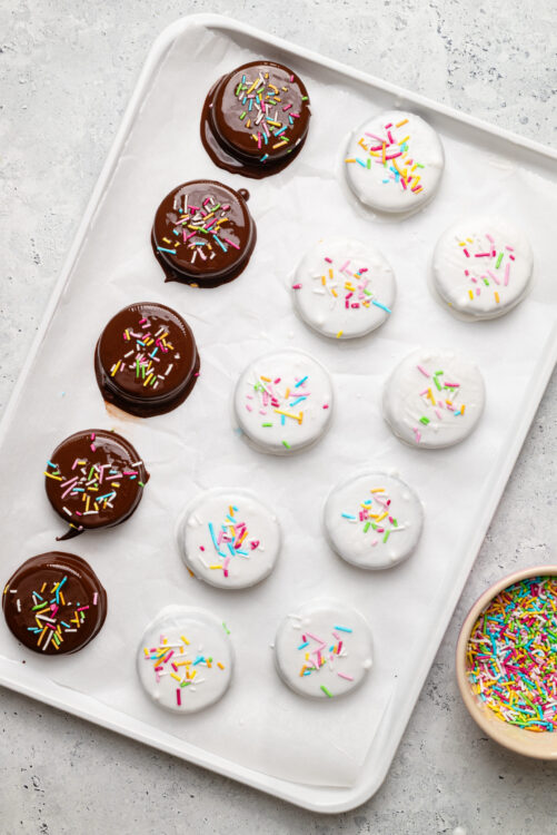 - Place the dipped Oreos on the prepared baking sheet immediately after dipping. If you like, sprinkle a few toppings on each cookie while the chocolate is still wet. Let the cookies sit until the chocolate hardens.