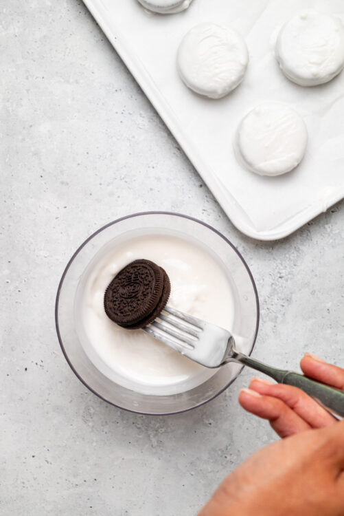 - Using a fork, dip an Oreo cookie fully into the melted chocolate. Let the excess drip off. Dip half of the Oreos, then melt the dark chocolate wafers in a separate bowl and repeat the dipping process with the remaining Oreos.