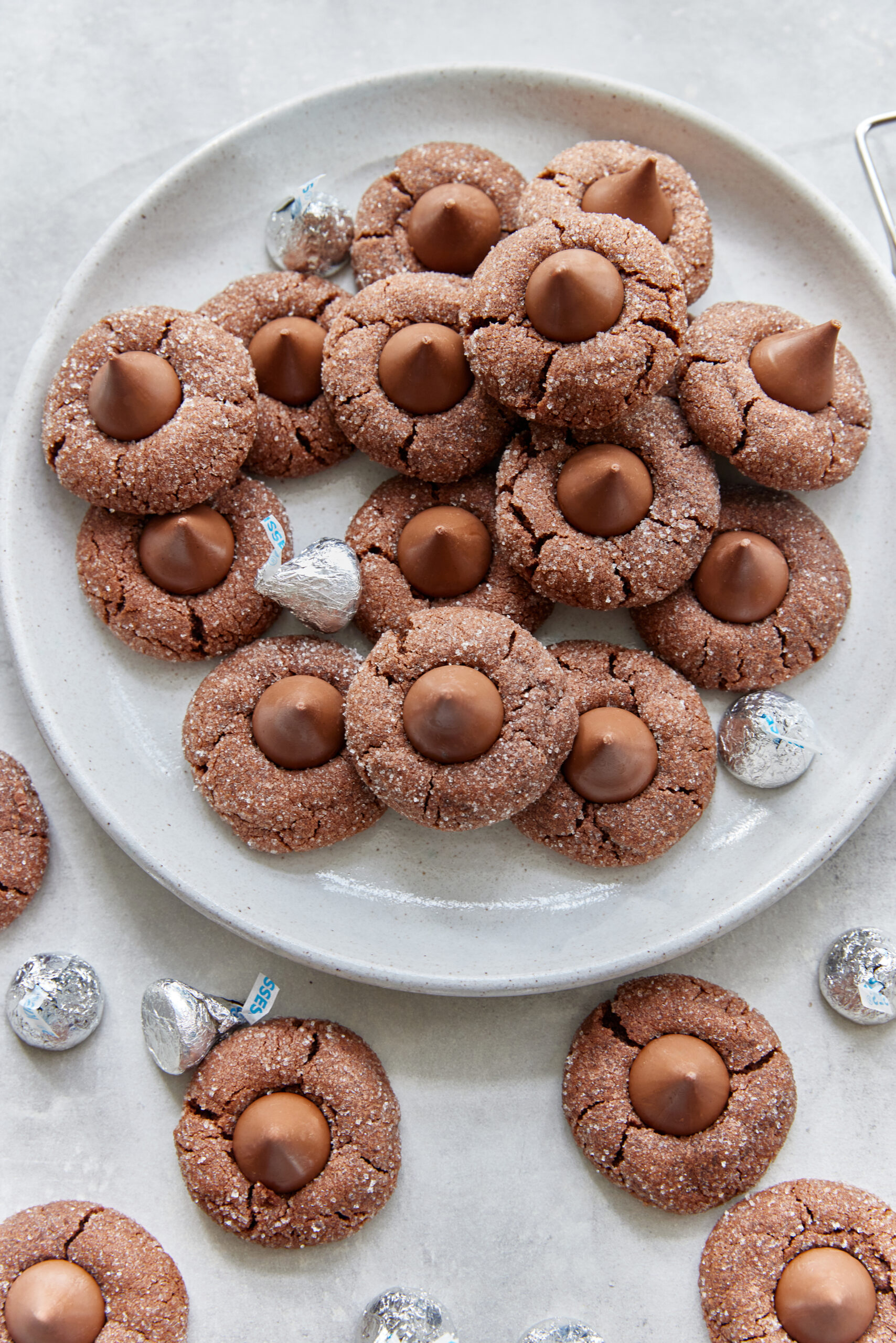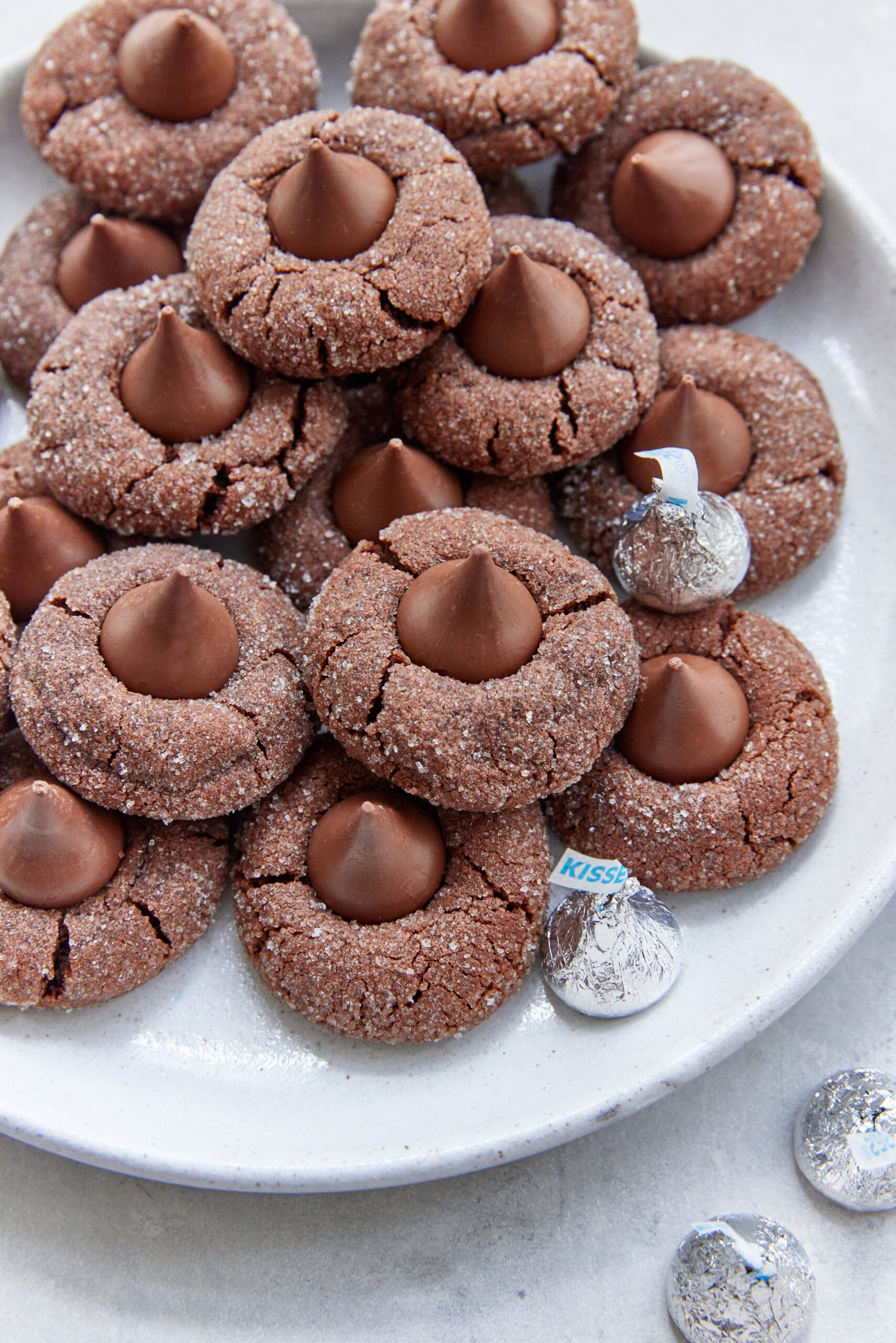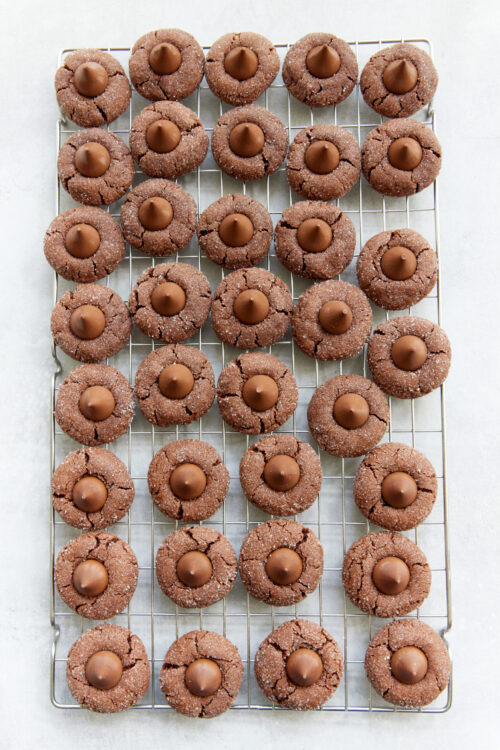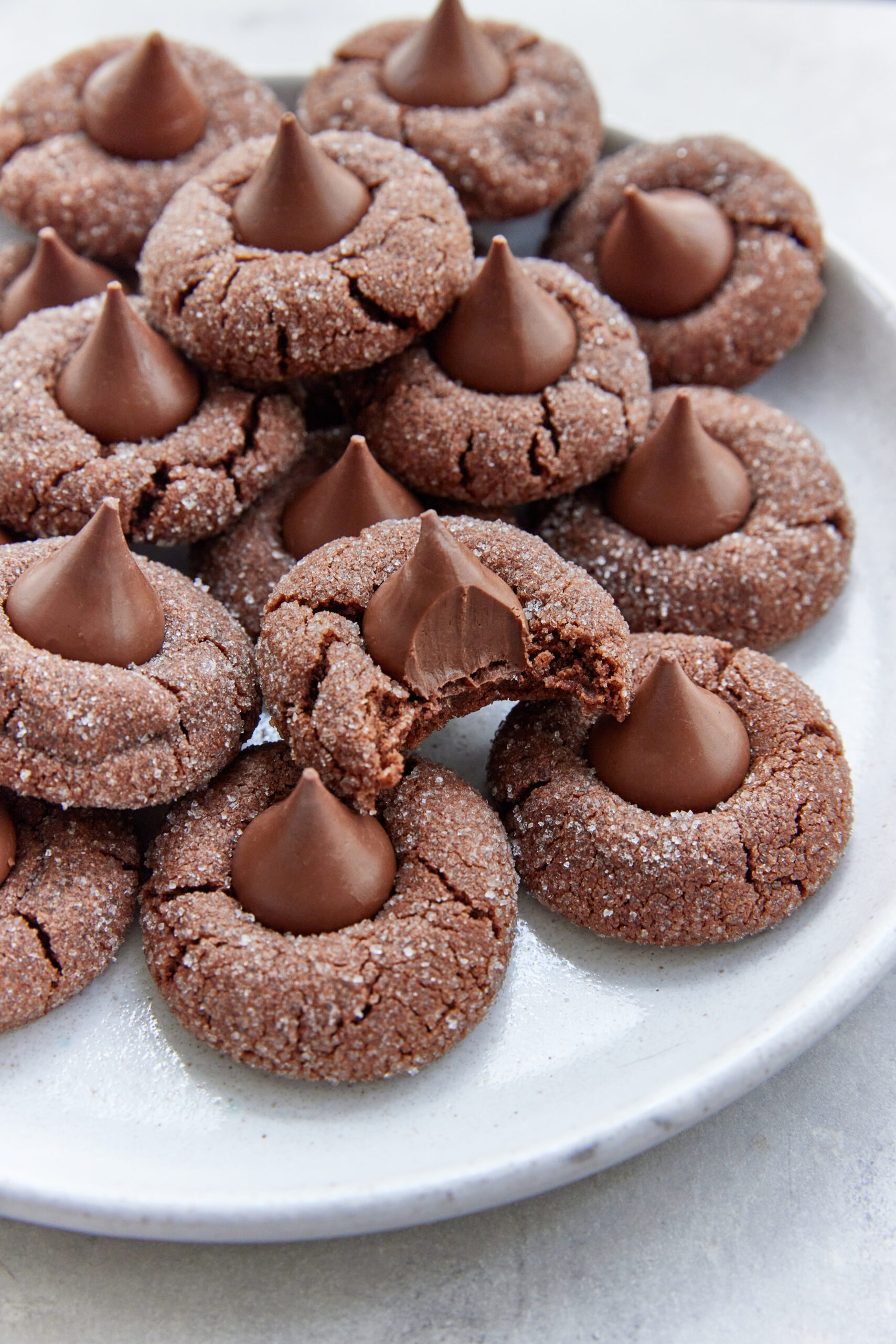 One bite in and you’ll get what I mean. The cocoa and melted chocolate blend beautifully with the dough. Texture-wise, they’re fudgy without feeling like you’re eating a brownie. And don’t forget the sugared edges—they give the cookies a snow-kissed crunch. But the definitive crown jewel here is the Hershey’s Kisses. Around the holidays, we always have a bag or two on hand for recipes and, let’s face it, binge snacking for Christmas movie marathons. Anyway, you simply can’t make these cookies without them.