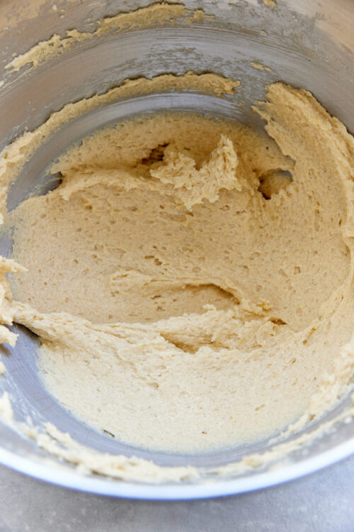 - In a large bowl, beat the unsalted butter, granulated sugar, and light brown sugar until light and fluffy. Mix in the egg and vanilla extract.