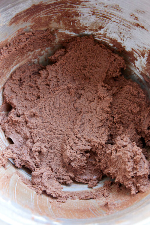 - Add salt, baking powder, and cocoa powder to the bowl. Then gently mix in the melted chocolate. Gradually add the all-purpose flour, one cup at a time, mixing until the dough comes together. If the dough feels too sticky, chill it in the refrigerator for 15-20 minutes.