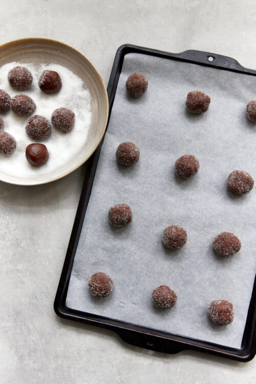 - Using a small cookie scoop or tablespoon, form dough balls. Roll each ball in granulated sugar and place them 2 inches apart on your prepared baking sheet.