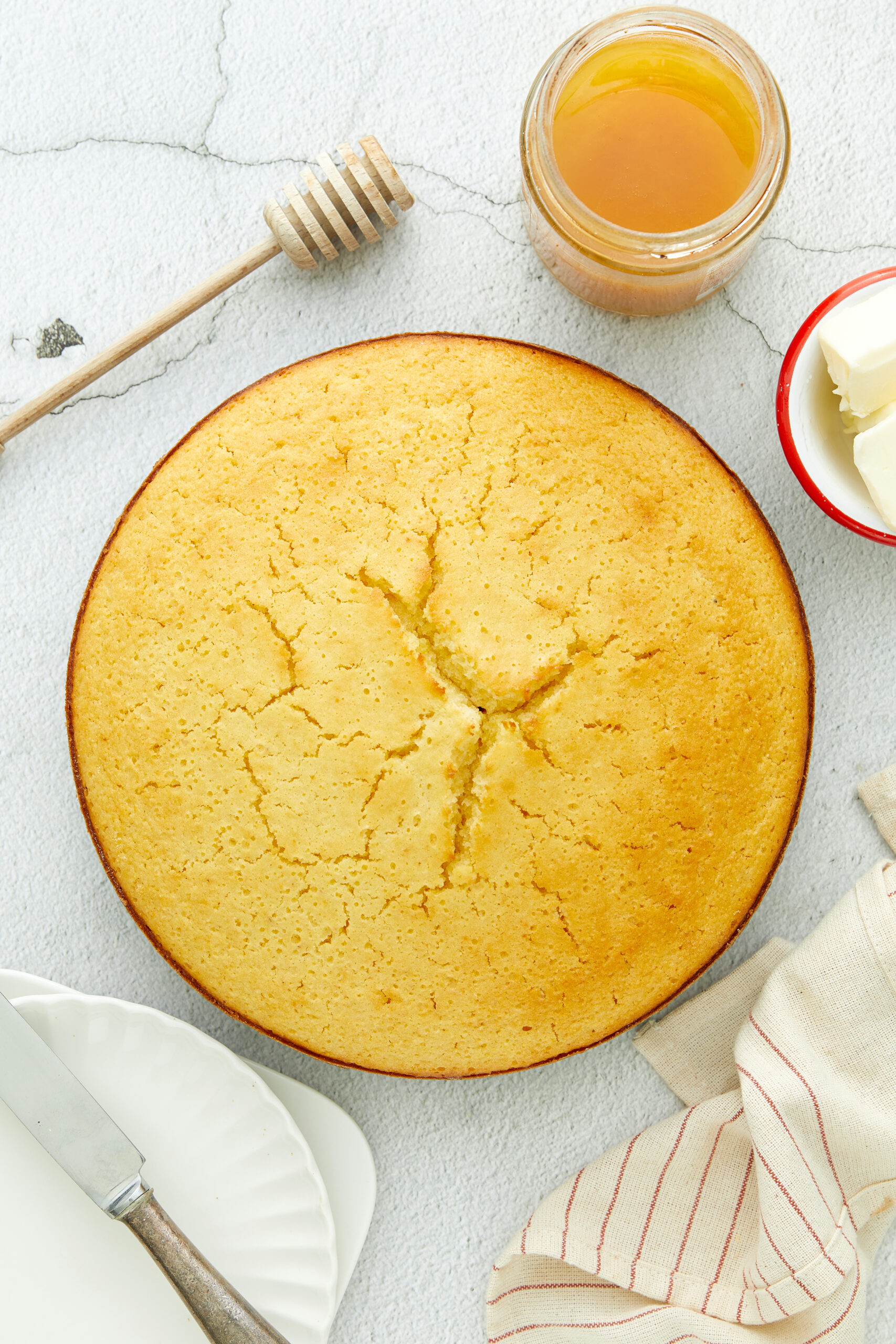 - Bake in the preheated oven for 20 to 25 minutes, or until a toothpick inserted in the center comes out clean. Let the cornbread cool slightly, then serve it with butter or honey, if desired.