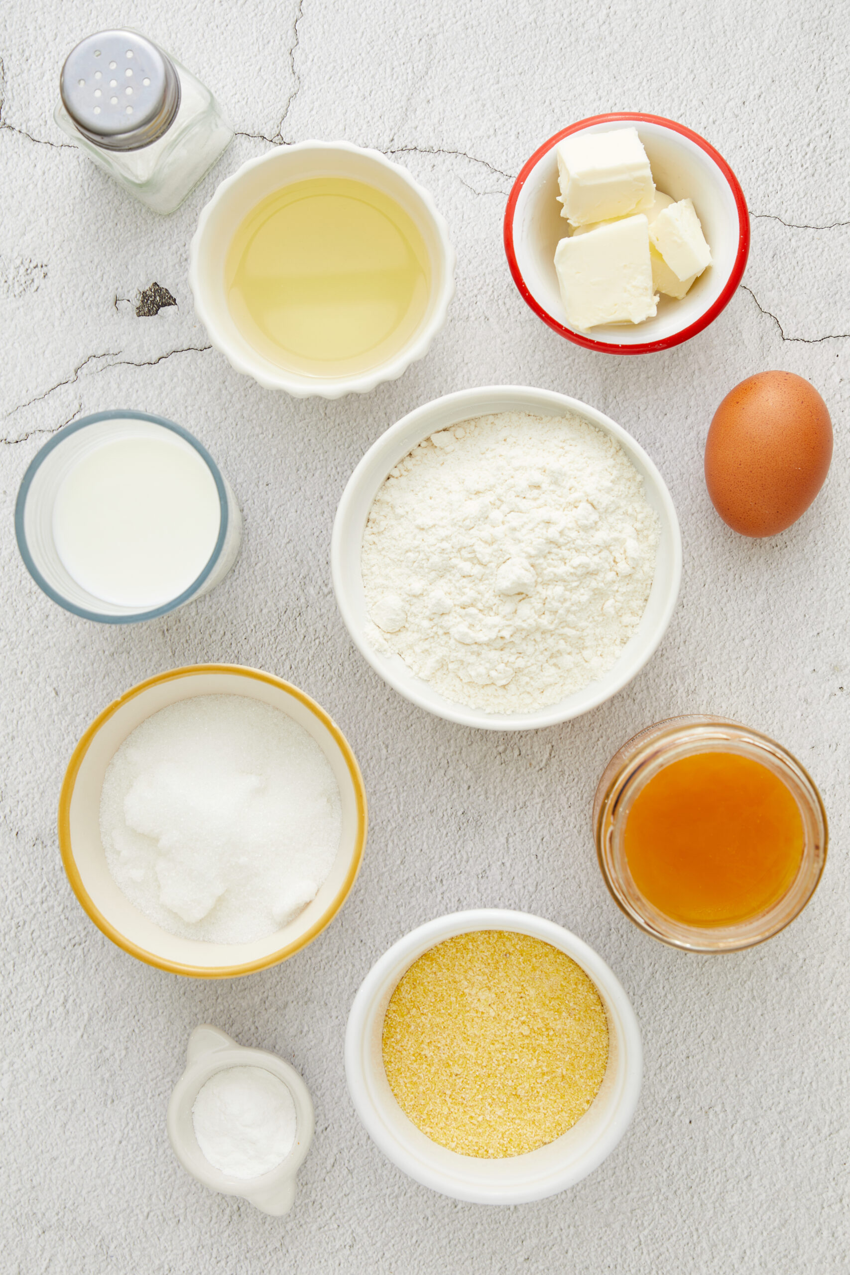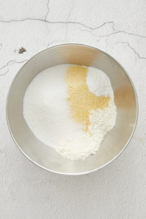- In a large bowl, whisk together the flour, cornmeal, sugar, baking powder, and salt.