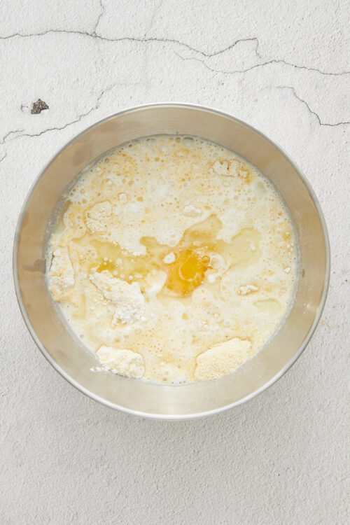 - Add the milk, vegetable oil, and egg to the dry ingredients. Whisk until just combined, being careful not to overmix.