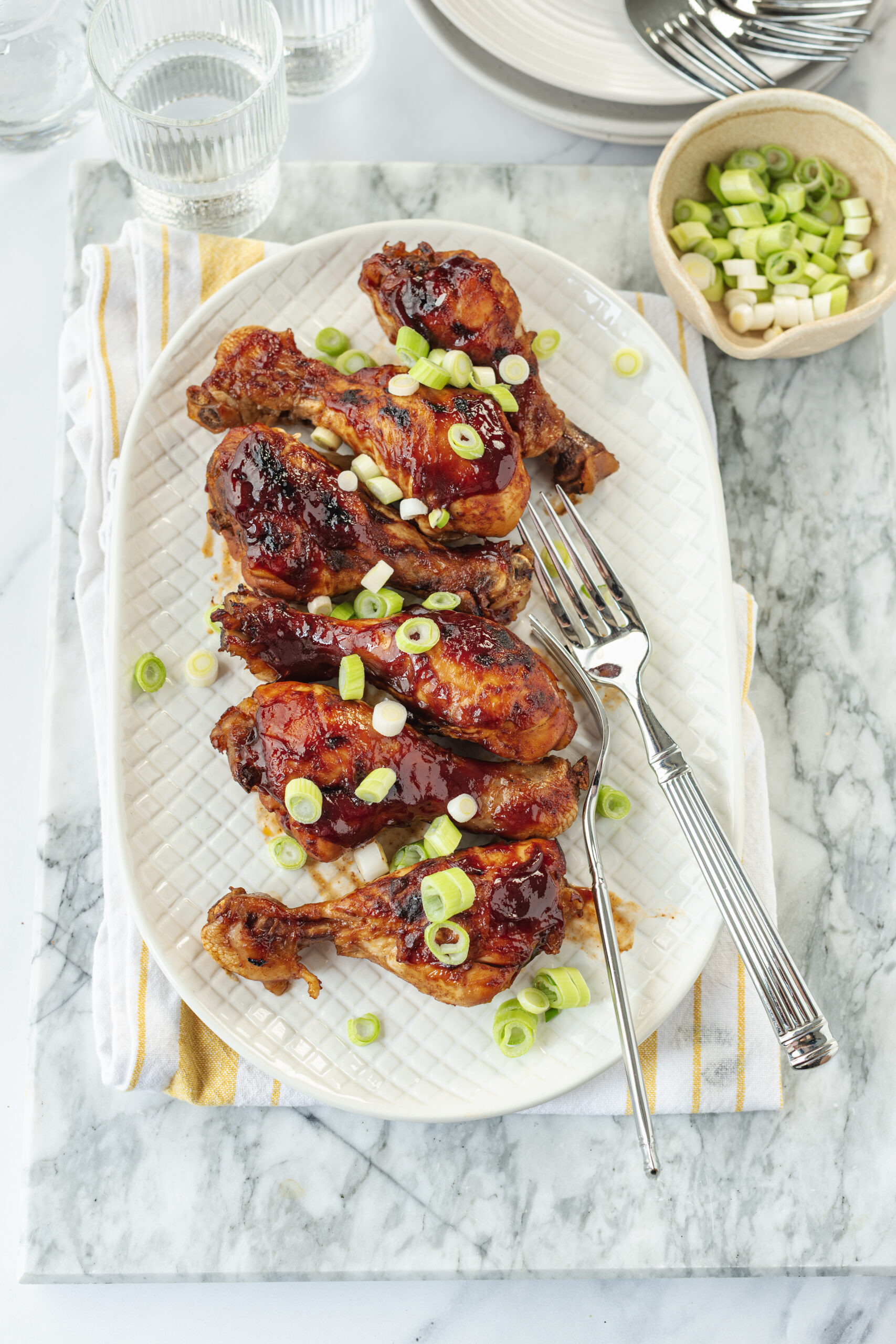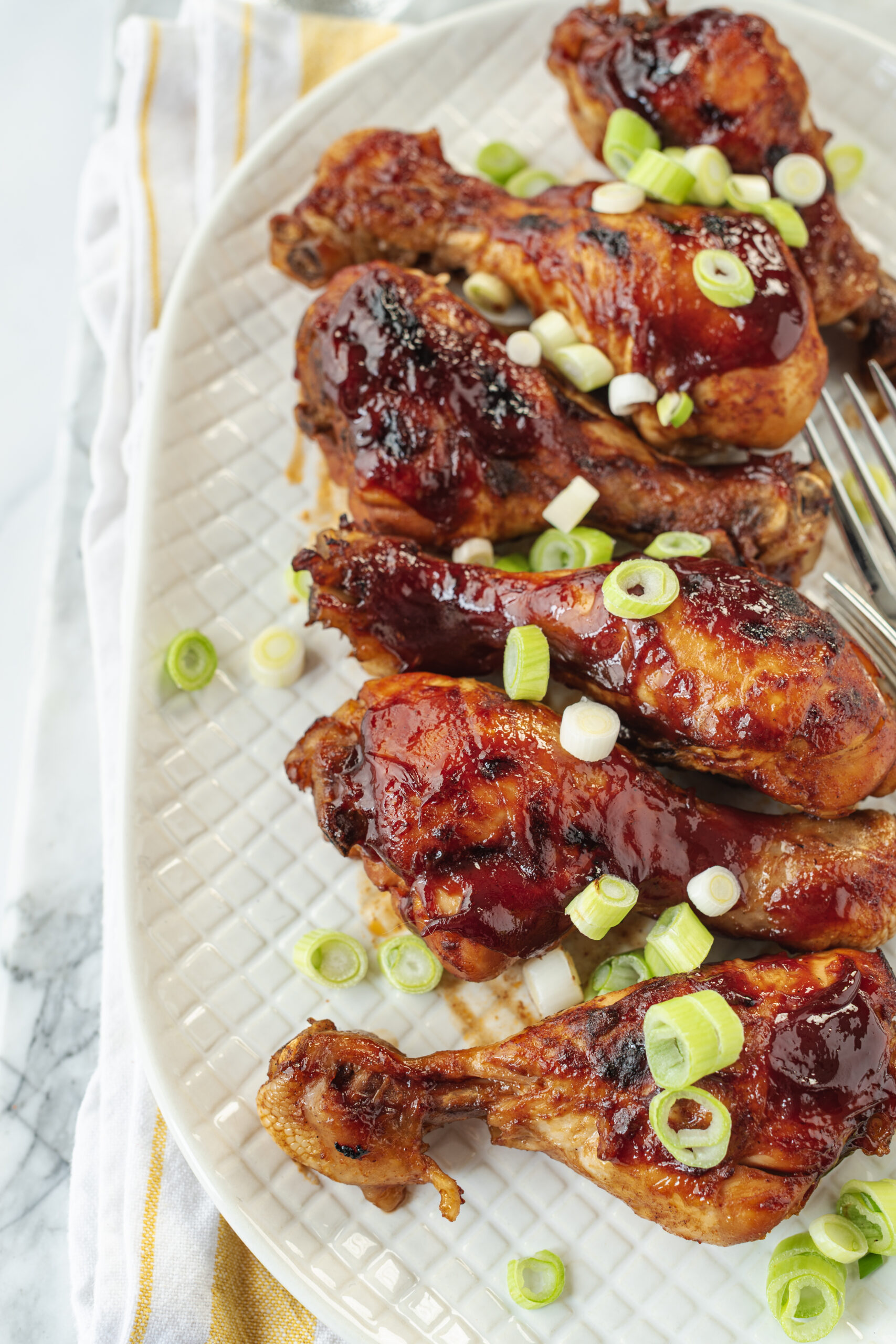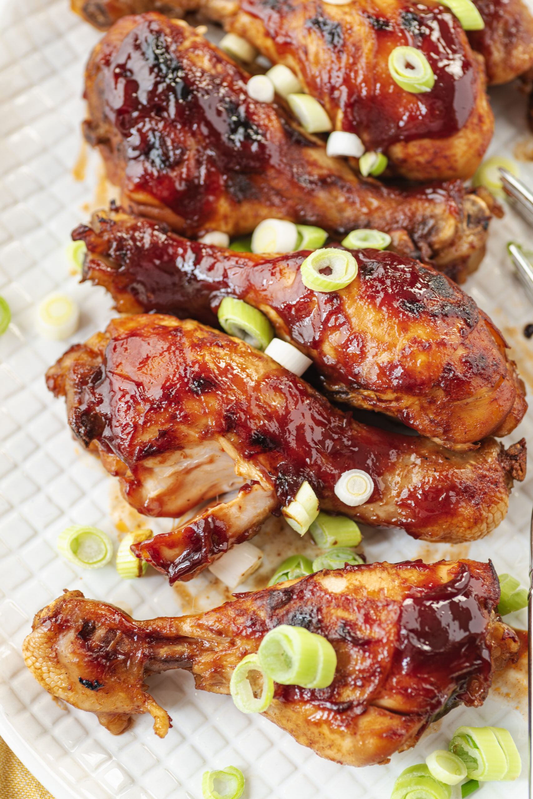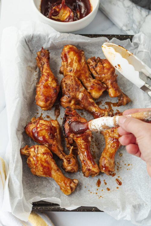 Refrigerate in an airtight container for up to 4 days. When I reheat the drumsticks, I usually brush on a little extra BBQ sauce to reinvigorate the flavor and texture. Set your oven to 350°F and bake for about 15 minutes. You could microwave them, but the skin won’t stay crispy—try broiling them for about 2 minutes.