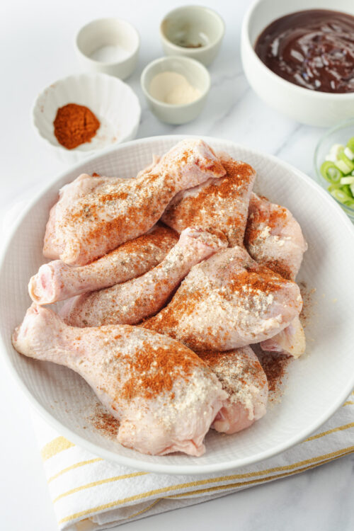 - Pat the chicken drumsticks dry. Sprinkle salt, black pepper, garlic powder, and smoked paprika evenly over the drumsticks.