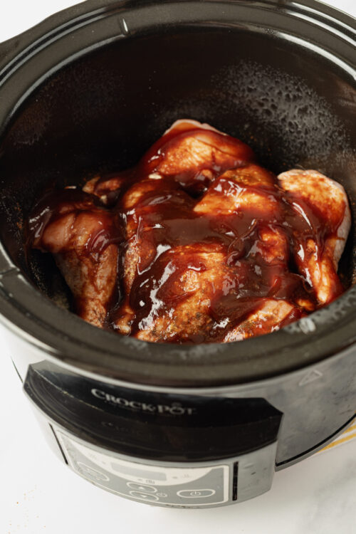 - Pour 1 1/2 cups of BBQ sauce over the chicken, ensuring each piece is well coated.
