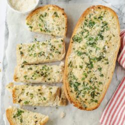 I really doubt you’ll have leftovers, but let’s pretend you do. Store the garlic bread in an airtight container or wrap it in foil. It should keep in the fridge for up to 3 days. Reheat in the oven at 375°F for 5-7 minutes.
