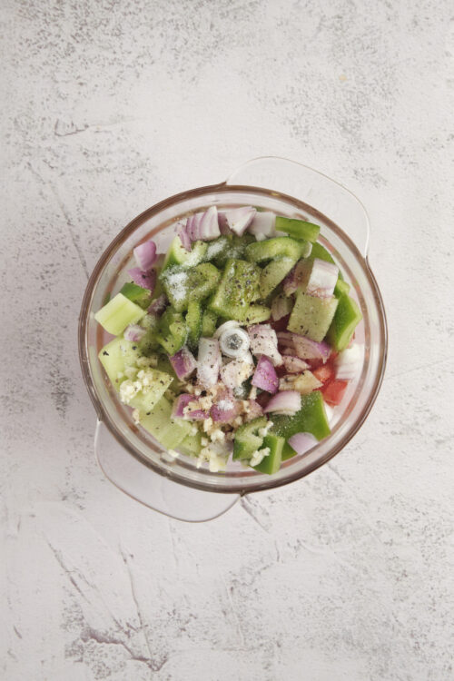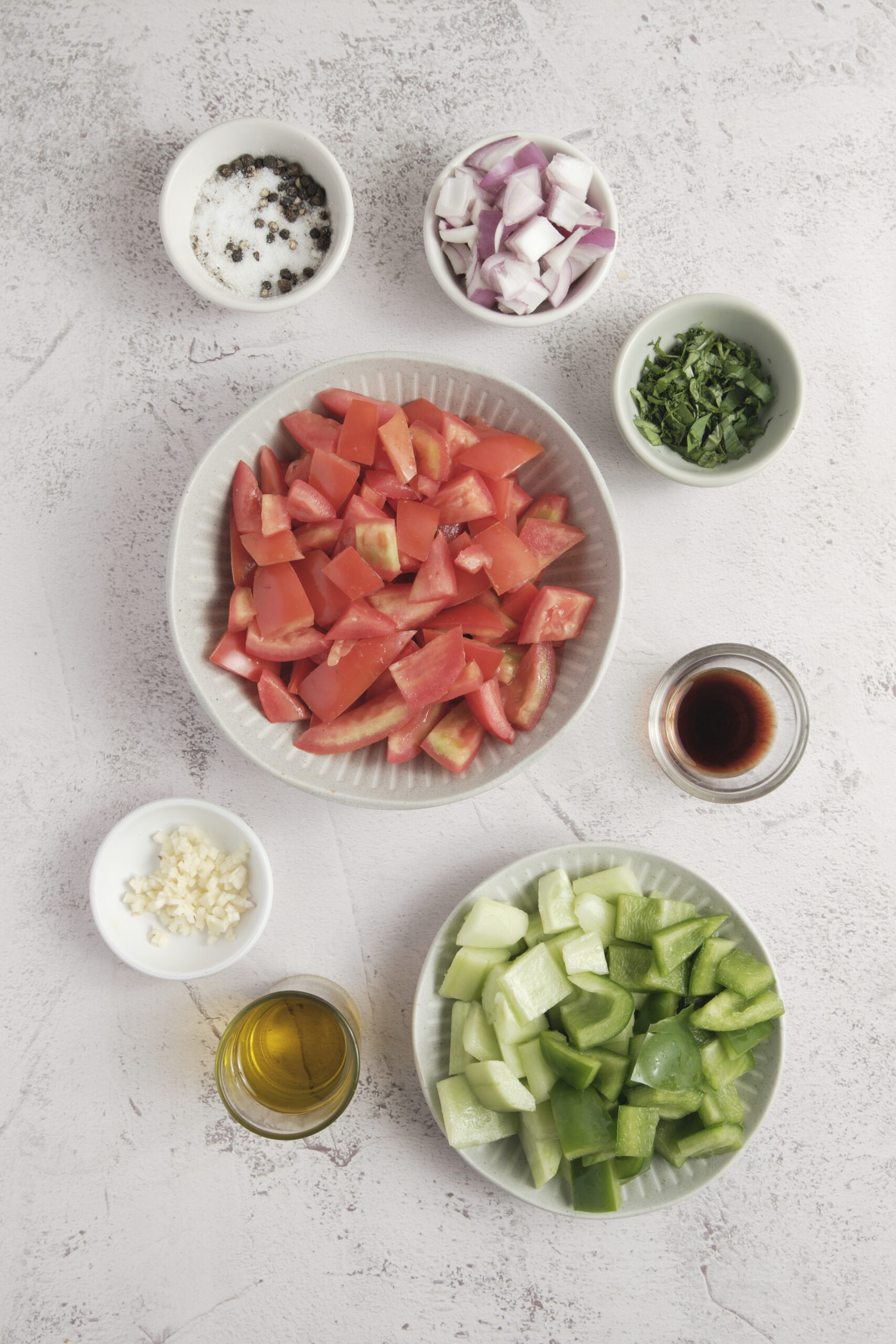 - In a blender, combine the chopped tomatoes, cucumber, green bell pepper, red onion, and garlic. Add the olive oil, sherry vinegar, salt, and black pepper. Blend until the mixture is smooth.