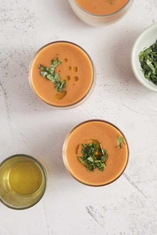 Our gazpacho recipe is quite simple to prepare, and the result is a cold, vibrant blend of garden-fresh flavors enriched by the olive oil and brightened by the sherry vinegar, which also supplies a wonderful tanginess. It’s a perfect summer dish, though we enjoy it year-round.