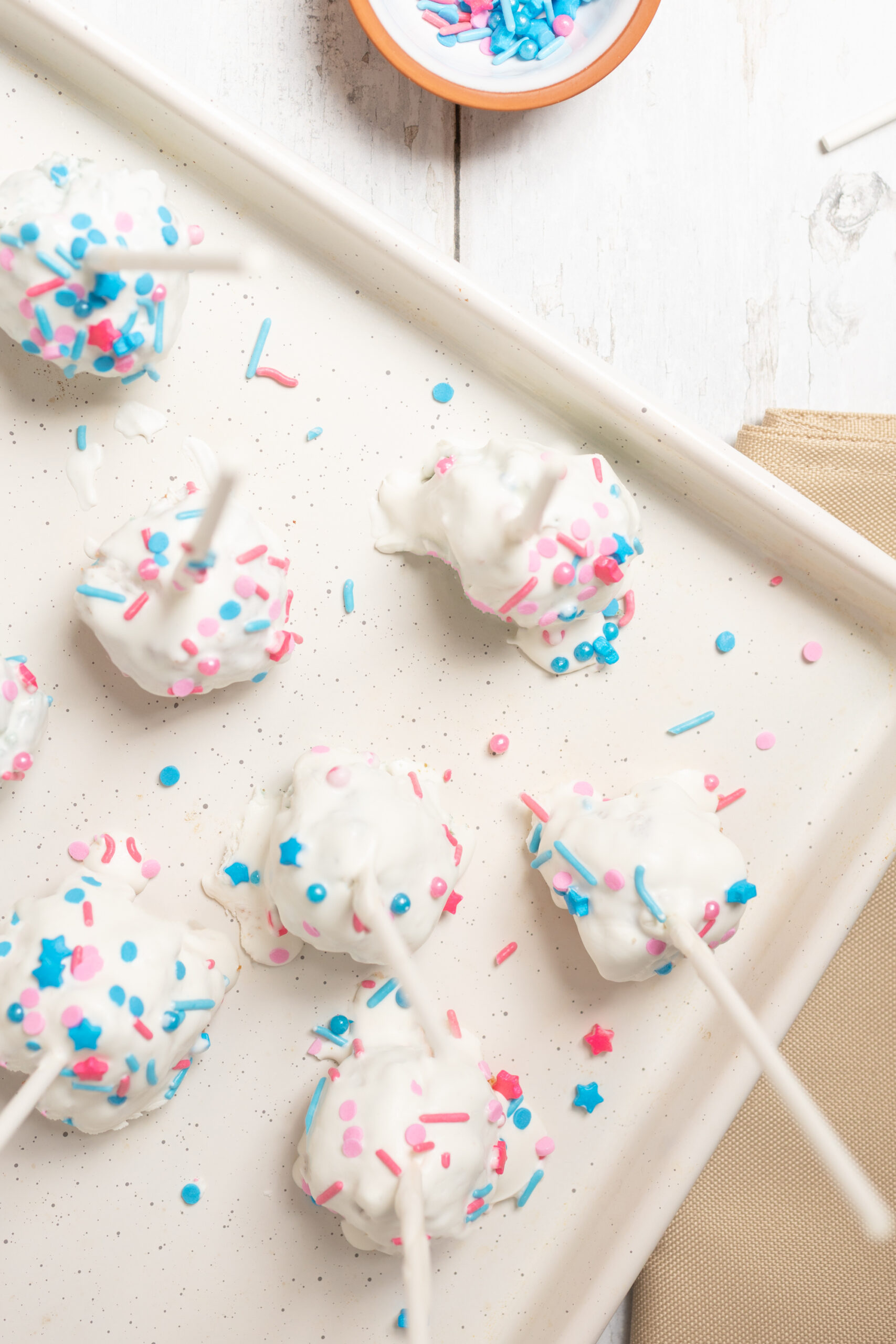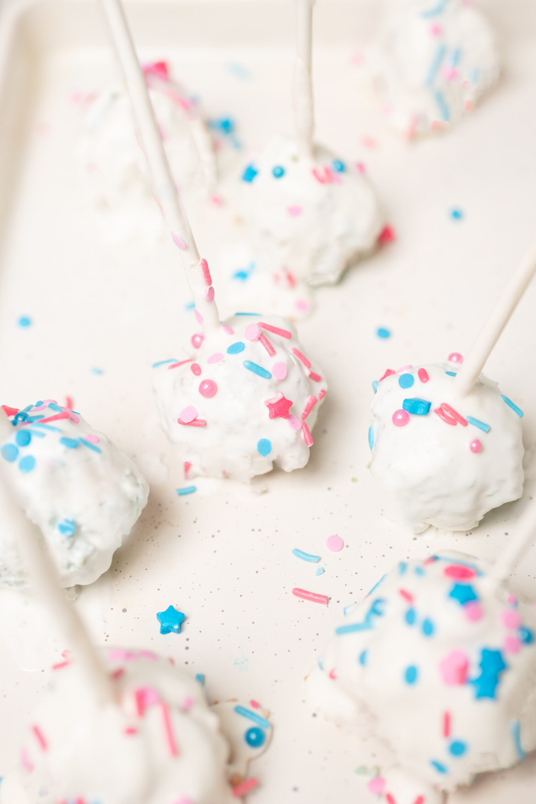 - Dip each cake pop into the melted coating, letting the extra drip off. Immediately sprinkle with blue and pink sprinkles before the coating hardens. Let the cake pops set completely before serving.
