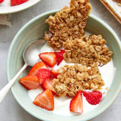 During the week, I eat high-protein yogurt with fresh fruit almost every morning for breakfast. It’s portable, filling, and healthier than the muffins or pastries I see at the local coffee shop when I stop in for my morning joe! I used to buy granola clusters to sprinkle on top to add a little crunch and texture to my breakfast yogurt, but that gets expensive, and many of the store-bought brands are laden with sugar. Once I started making my own granola clusters, I realized I would never go back to store-bought. Homemade granola clusters are an easy, make-ahead alternative.