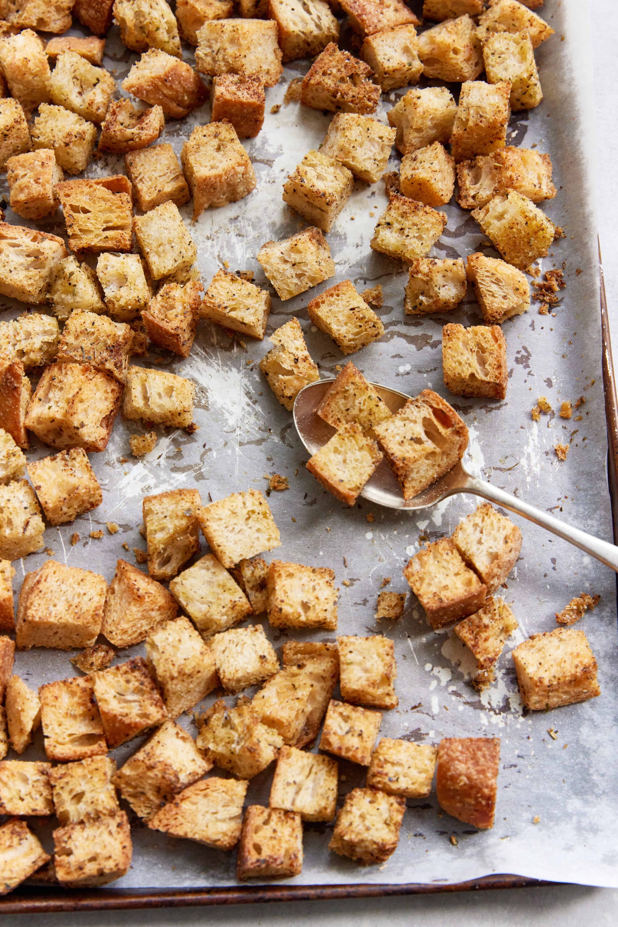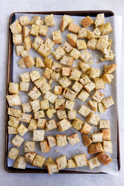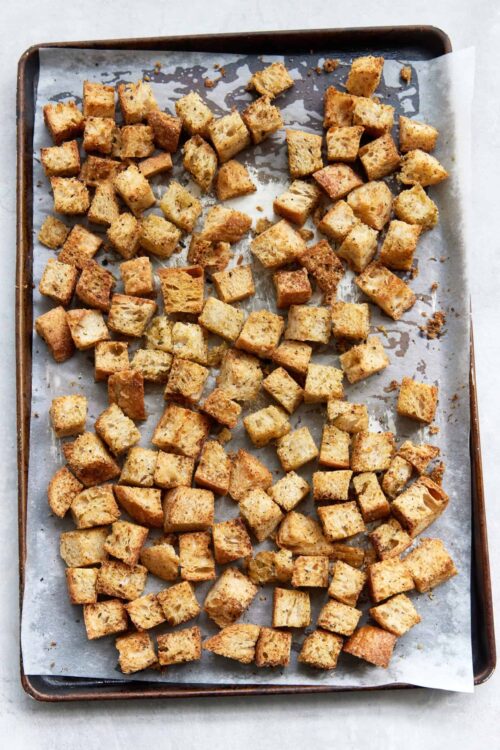 - Remove the baking sheet from the oven and let the croutons cool completely. Enjoy immediately or store in an airtight container for up to 1 week.