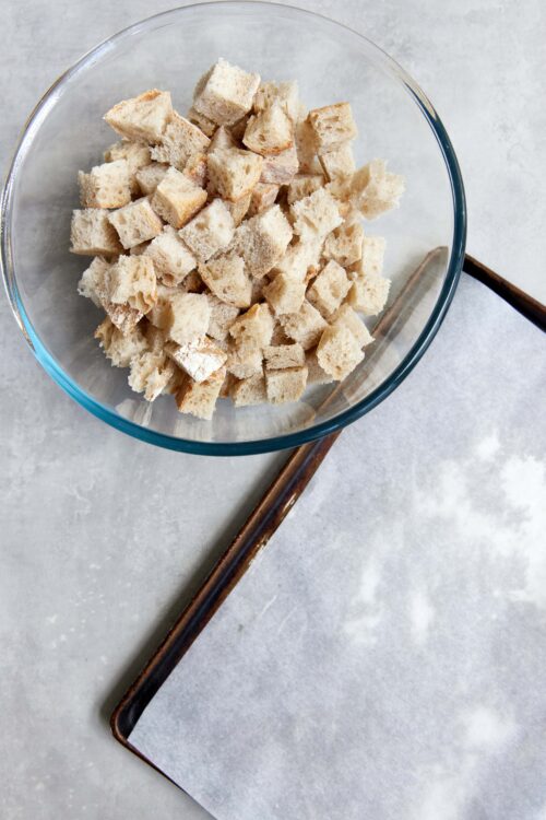 - Preheat your oven to 375°F. Line a large baking sheet with parchment paper. Cut your loaf into 3/4-inch cubes and place them in a large bowl.