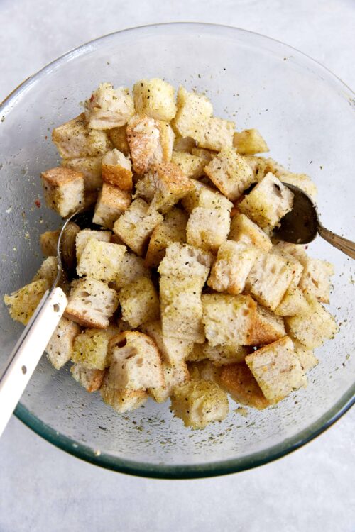 - Drizzle olive oil over the bread cubes. Sprinkle with Italian seasoning, garlic powder, salt, and black pepper. Toss gently to coat evenly.