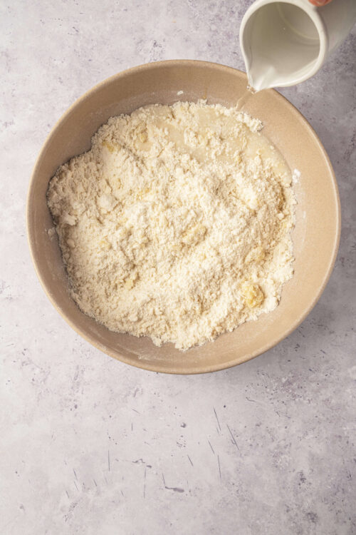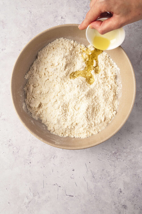 - Gradually add the water and stir until a wet dough forms. It will be slightly sticky but should stay together. If it's still too crumbly, add a small amount of water little by little until the dough comes together.