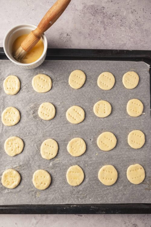 - Use a toothpick to poke a few holes in each cracker to prevent puffing. Brush with the beaten egg and sprinkle with the remaining salt.